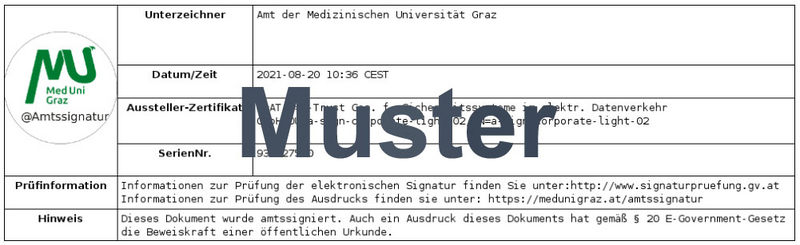 The official signature visually consists of the figurative mark (comparable to a “round stamp”) of the Medical University of Graz and the indication that the document has been officially signed. The Medical University of Graz also provides verification mechanisms for the electronic signature and a verification option for the printout.
