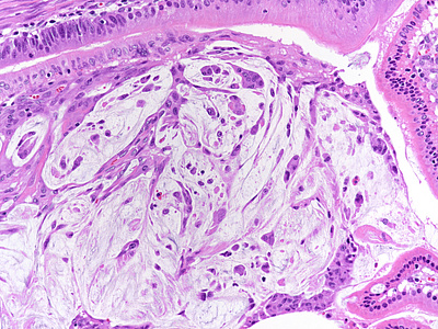 Peutz-Jeghers polyps are hamartomatous polyps, which may occur in syndromic context or sporadically, throughout the entire gastrointestinal tract, especially within the small bowel (65-90%). About 10% of small intestine Peutz-Jeghers polyps have foci of misplaced epithelium with herniation throughout the submucosa and muscularis propria, caused by prolapse and peristaltic kneading, producing a transmural enteritis cystica profunda configuration. This pseudo-invasive pattern is a well-recognized phenomenon, encountered more frequently in polyps larger than 3 cm in diameter, which implies a dangerous pitfall, since these polyps may be mistaken for malignancy. However, there are features that aid the discrimination between misplaced epithelium and malignancy. The following features favors a benign nature of the lesion: (i) lack of a true infiltrative growth pattern; (ii) presence of enteritis cystica profunda, with deep mucinous cysts; (iii) absence of atypical epithelium in the deep glands; (iv) presence of lamina propria surrounding the displaced glands; and (v) absence of stromal desmoplasia. Dysplasia is rare in Peutz-Jeghers polyps, and malignancy has only anecdotally been reported.