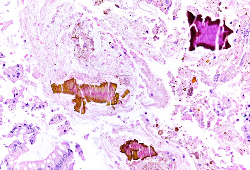 On macroscopy, multiple ulcers were visible on the mucosa of the colon. Histology showed ulcers with prominent granulation tissue, reaching the muscular wall of the bowel. They were surrounded by colonic mucosa with regenerative architectural changes (Panels A-B). In the ulcers and on the surface mucosa, yellow-pink polygonal foreign material with scale-like appearance was seen, which corresponded to the given sevelamer drug (Panels C-D).