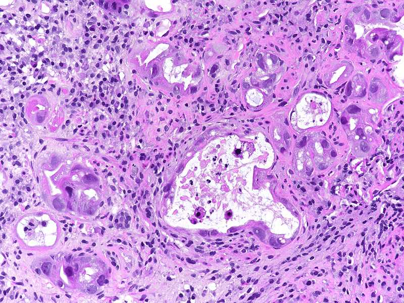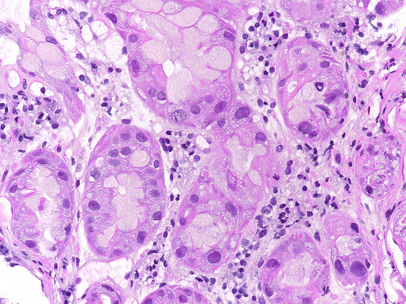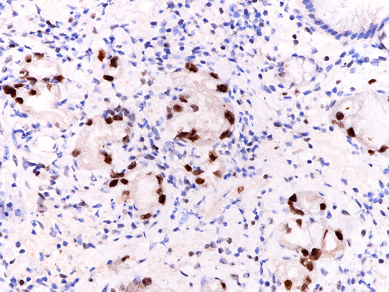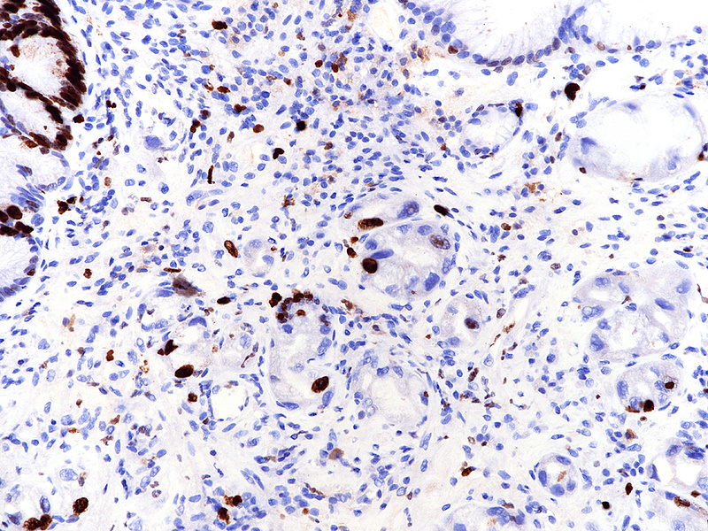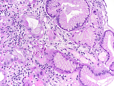 The presented case demonstrates severe atypia of the gastric epithelium, which exceeds what is typically seen in ischaemic injury and may lead to the erroneous diagnosis of dysplasia and/or malignancy. Drug toxicity explains these findings. Specifically, fotemustine causes interstrand crosslinking of DNA, which prevents DNA replication, and ultimately leads to apoptosis in a p53 dependent manner. Interestingly, Ki-67 labeling was low in our case. This may be attributable to the fact that the highest levels of nuclear Ki-67 staining are reached during the M phase of the cell cycle, which the epithelial cells failed to enter due to the drug effect (Varelas et al. 2022).
