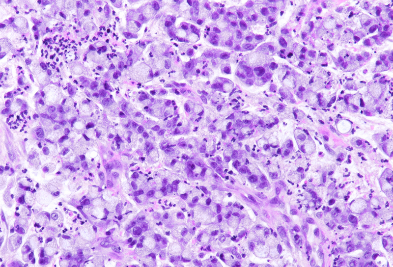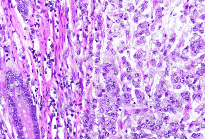 An 87-year-old female patient presented with iron deficiency anemia. Endoscopy showed in the ascending colon, a stenotic, centrally ulcerated lesion measuring 5cm in greatest dimension. Biopsies were performed, followed by right hemicolectomy.