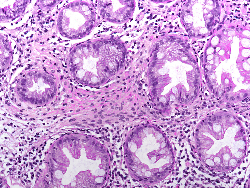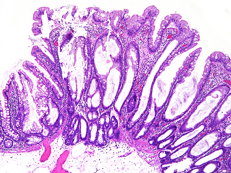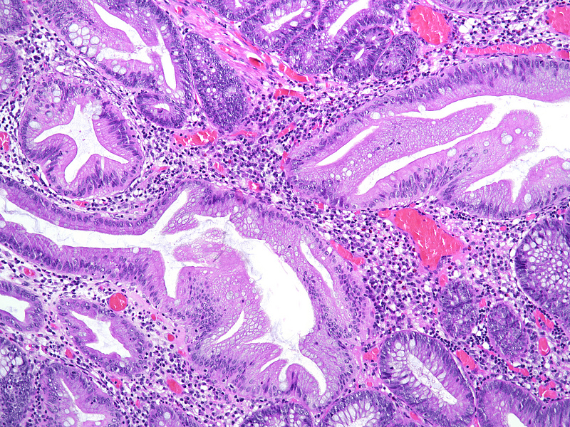Inflammatory pseudopolyps and mucosal prolapse of the large intestine can also exhibit the same eosinophilic cell changes seen in TSA and display some serration mimicking a SSL or TSA. The differential diagnosis between these entities can occasionally be challenging. Inflammatory pseudopolyps and mucosal prolapse of the large intestine have more marked inflammation in the lamina propria and crypts show more obvious architectural distortion.