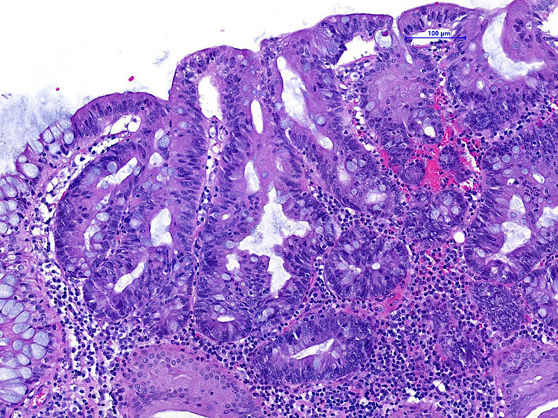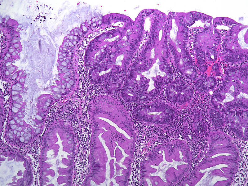 The other controversial points in serrated polyp diagnosis is the significance of traditional serrated adenoma-type cells in various colonic lesions. Some authors calls this enteric metaplasia, which have characteristics of senescent cells rather than dysplastic cells while others consider that the presence of this cell type in a serrated polyp represents a form of serrated dysplasia. The different opinions can lead to the confusion in the differential diagnosis between TSA and SSLD. Rish K.Pai et all recommends that the term ‘serrated dysplasia’ should only be used for the “high-grade” dysplastic changes.