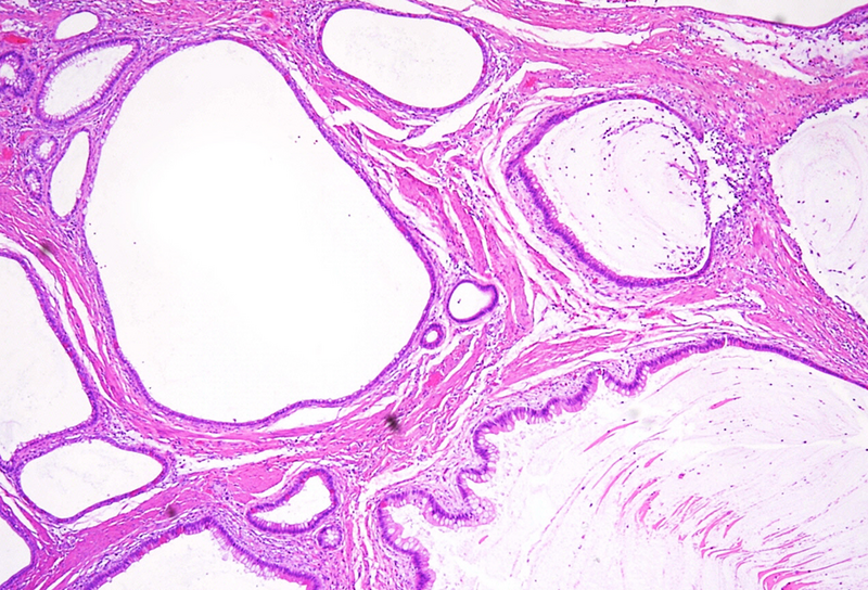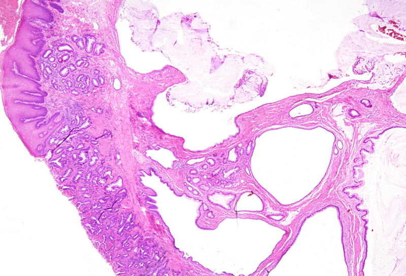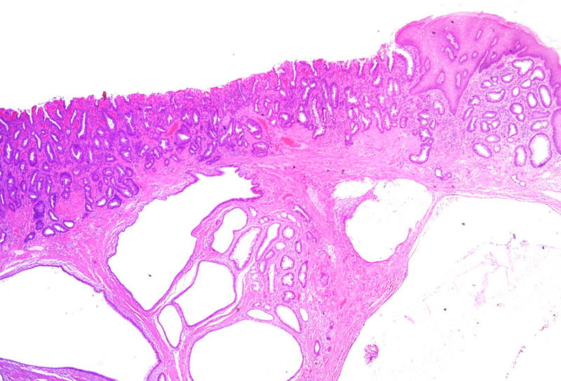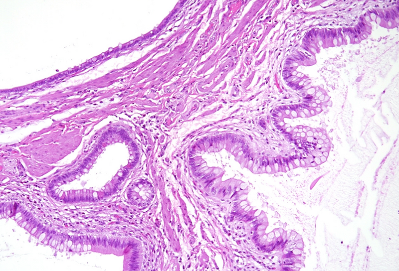 Histologically, it is characterized by the presence of either localised, segmental, or diffuse mucus-filled cysts of the deep submucosa and even muscularis propria. Size of the cysts may differ, depending on localisation and diffuse morphology, lesions can measure up to even 2 cm. The lining epithelium lacks atypia, with only minor nuclear irregularities in case of secondary inflammatory changes. The overlying mucosa is intact. Surrounding areas may contain fibrosis and hemosiderin laden macrophages. The cysts may rupture causing mucin dissemination into the surrounding tissue, potentially followed by degenerative calcification. Differential diagnosis mainly includes mucinous adenocarcinoma, which may be identified by nuclear dysplasia and/or desmoplastic response.