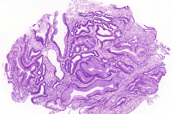 Histologically, lamina propria of gastric mucosa was expanded with amorphous paucicellular stromal deposits with cracking artifacts (Panels A and B). These depositions stained red with Congo Red stain (Panel C) and demonstrated characteristic apple-green birefringence in polarized light (Panel D). No malignancy was observed. Consequently, the final diagnosis was gastric amyloidosis.