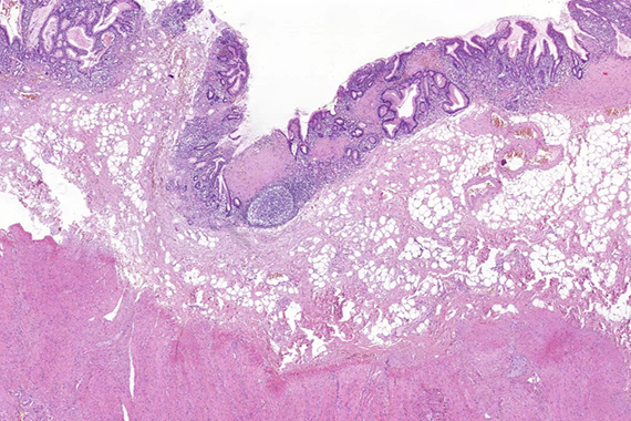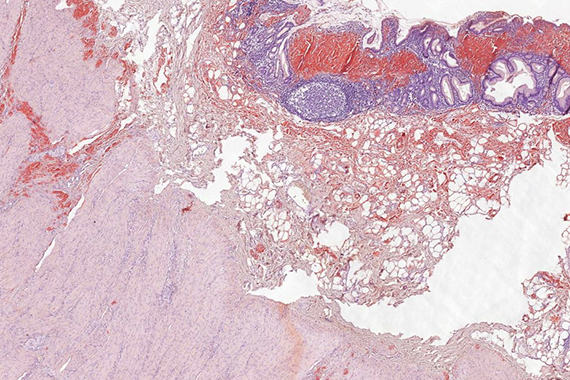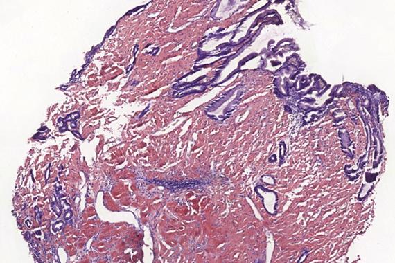 Endoscopy revealed diffuse infiltration of gastric wall along the lesser curvature. The mucosa was pale, thickened, friable and easily bleeding. Based upon endoscopic findings a biopsy of gastric mucosa was performed with the suspicion for infiltrative gastric cancer.