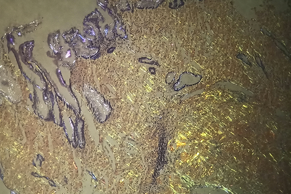 On further thorough clinical examination no other foci of amyloid deposits were found, no signs of underlying systemic hematological disorder were revealed, and subtyping of amyloid deposits in gastric biopsy (performed in another institution) proved them to be of an AL-type.