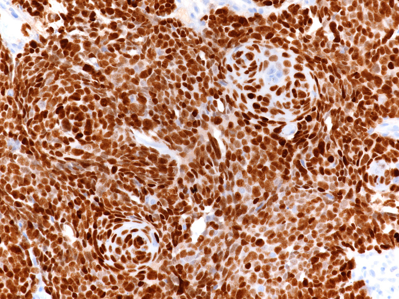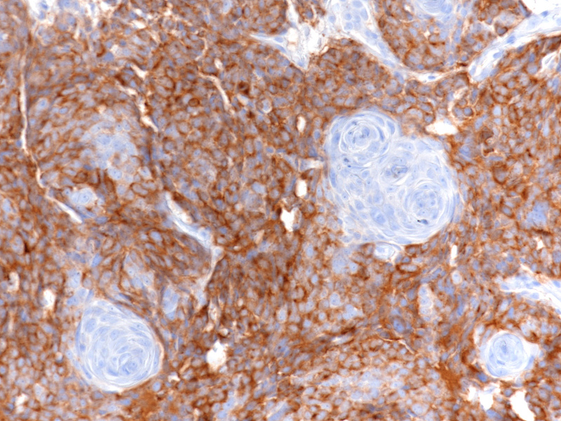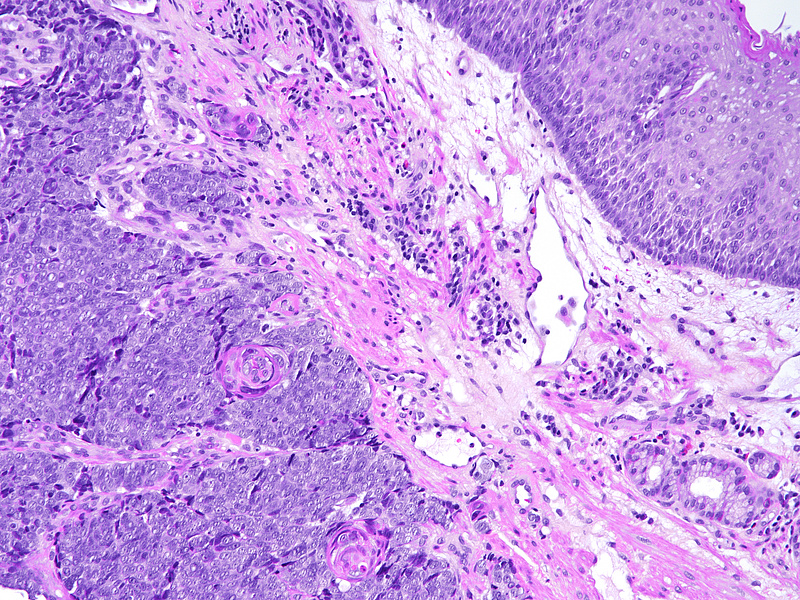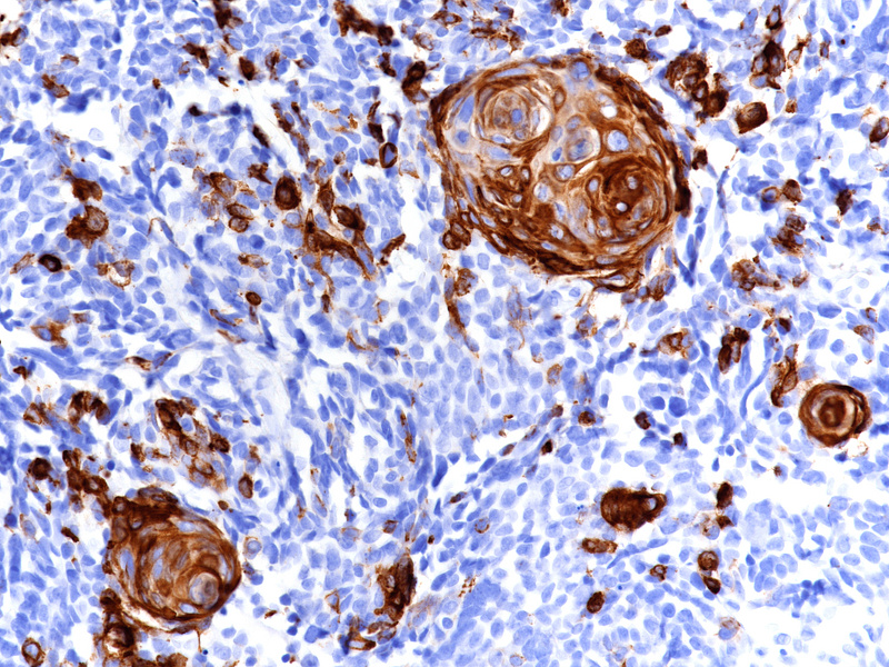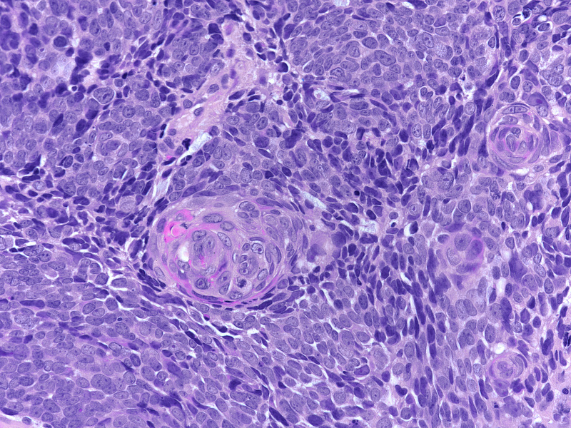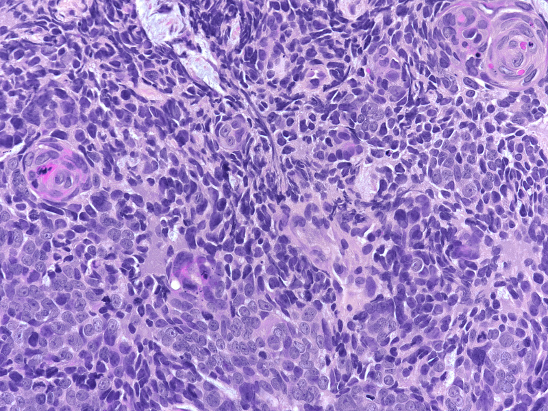 On low power the lesion is composed of sheets of monomorphic, overlapping small to medium sized malignant cells with irregular nuclear contours and finely dispersed chromatin without well-formed nucleoli (Panels A-B). Within these sheets of cells are demarcated areas of squamous differentiation, with formation of clearly visible squamous eddies and focal high-grade cytology (Panels C-D).