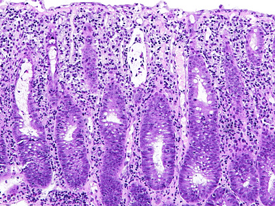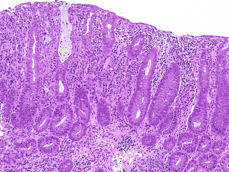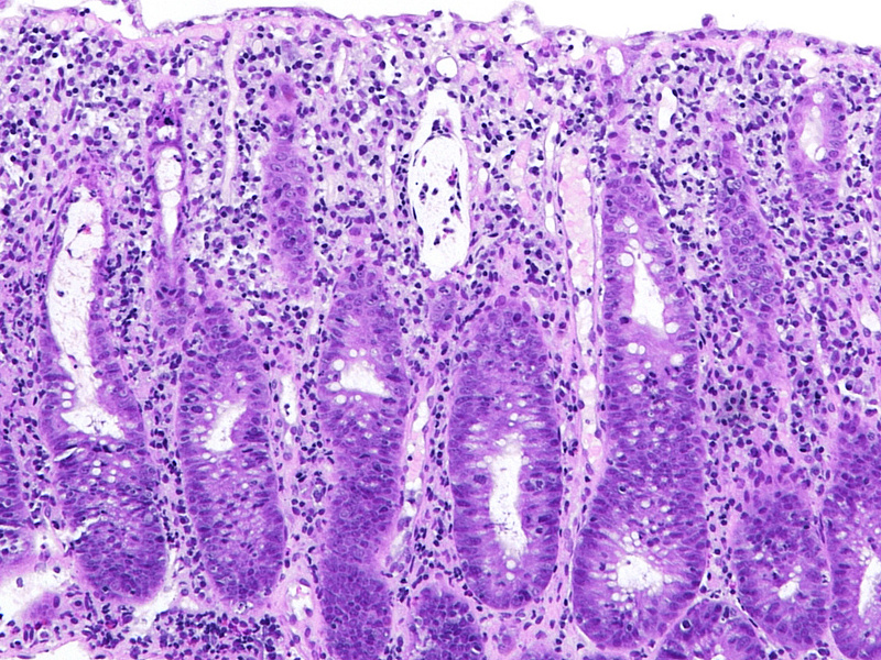 Histology showed mild crypt architecture distortion, increased lamina propria cellularity with mixed inflammatory cell infiltration containing plasma cells, lymphocytes, neutrophils, and scattered eosinophils. Mild basal plasmacytosis was present. The superficial epithelium was flattened and focally eroded (Panels A-B). Crypts showed a prominent loss of goblet cells, with reduced secretion from the remaining ones. Neutrophilic cryptitis with the presence of apoptotic bodies in the epithelial lining was observed. Some crypts were attenuated, lined by flattened epithelium, and contained apoptotic debris and neutrophils. Scattered withering crypts were found (Panels C-D).