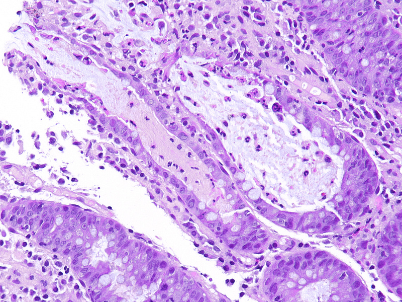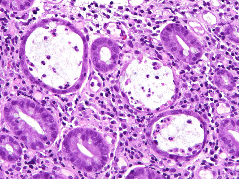These morphological findings of chronic active colitis with increased crypt epithelial apoptosis are suggestive of drug-induced colonic mucosa injury. Considering the patient’s known drug history of Pembrolizumab, Ipilimumab, and Nivolumab treatment, the diagnosis of immune checkpoint-inhibitor (ICI) therapy-associated colitis was made.