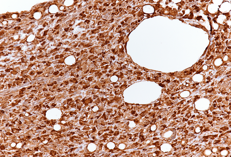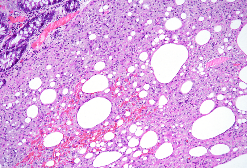 The resection specimen contained superficial remnants of the previously excised tubular adenoma (not shown). Close to the neoplastic glands, however within the submucosa, nodular aggregates of histiocytes were found (Panel A), that included vacuoles of varying size; these vacuoles were mainly empty, except for few tiny droplets of pale fluid or substance (Panels B and C). A CD68 immunostain confirmed histiocytic cell origin (Panel D). Pankeratin staining was negative within the lesion. No atypia was observed, and no eosinophils were present. The histological findings in combination with a history of polypectomy at the same site were consistent with the diagnosis of a “lifting agent granuloma”.