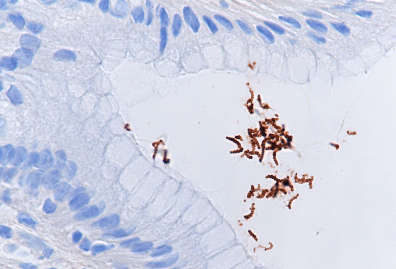 Histologic examination showed moderate chronic antrum gastritis with mild focal neutrophilic inflammation and small superficial mucosal erosions (Panel A). In the mucus layer close to the surface epithelium and in several of the foveolar pits, large, thin, corkscrew-shaped bacilli were found (Panel B) that could be highlighted with a H. pylori immunostain (Panels C-D). The characteristic morphology of the bacterial structures and their cross-reactivity with the anti-H. pylori antibody were consistent with Helicobacter heilmannii.