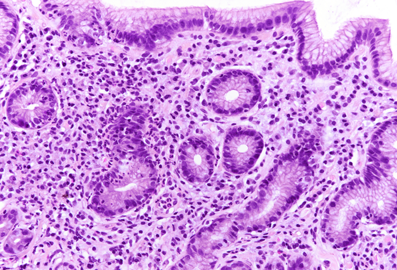 A 45-year-old man with a history of chronic abdominal pain underwent gastroscopy. Endoscopically, erythematous antrum mucosa was observed, and gastric biopsies were taken.