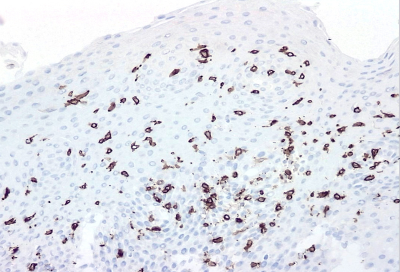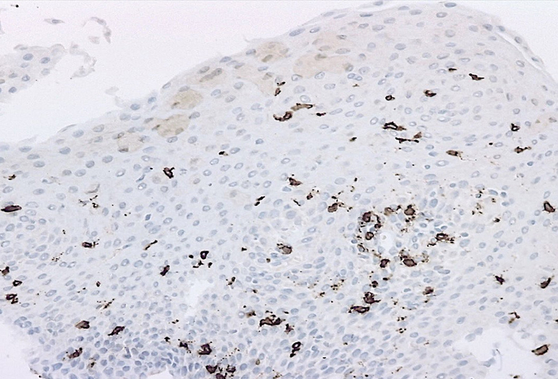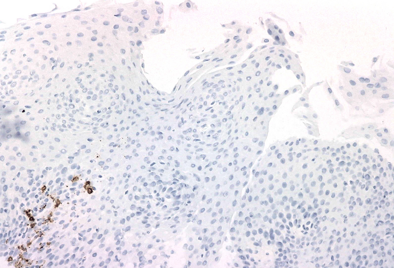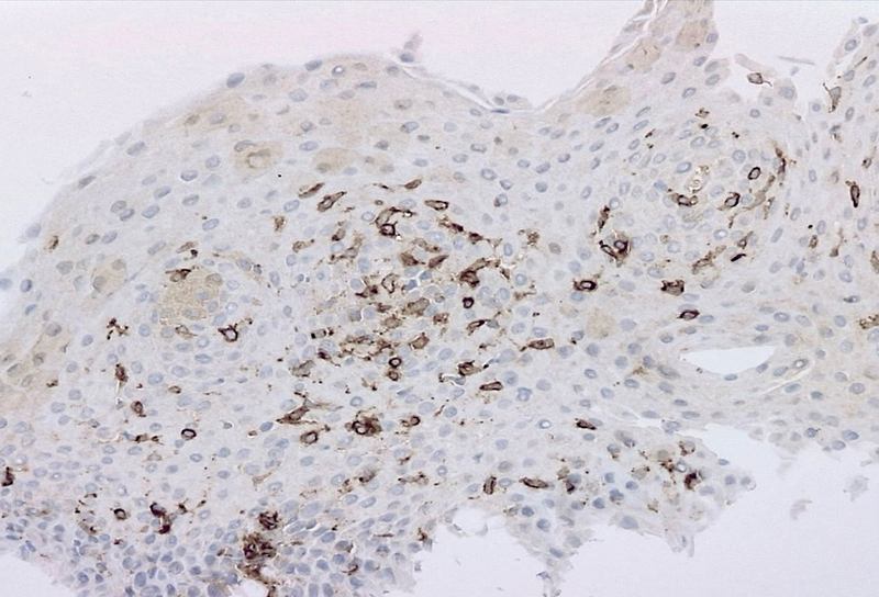 A 67-year-old male patient underwent upper-GI endoscopy for dysphagia and odynophagia. The endoscopic findings were unremarkable, and routine biopsies were taken.