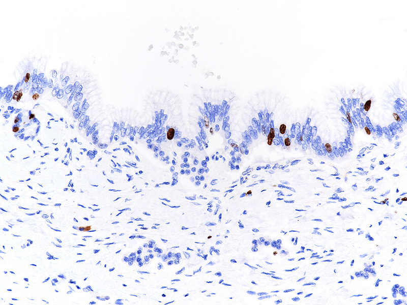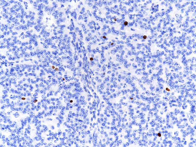 Upon magnetic resonance imaging (MRI) the pancreas contains several cystic lesions plus one partly solid, partly cystic lesion with a maximum diameter of 15 mm within the body. This lesion shows a biphasic pattern (Panel A). There are cysts lined by mucin-producing columnar cells with low grade dysplasia, consistent with a diagnosis of intraductal papillary mucinous neoplasm (IPMN). Other parts show a mainly solid, but also pseudoglandular growth of cuboidal cells with eosinophilic granular cytoplasm and centrally placed nuclei with “salt and pepper” chromatin and small nucleoli (Panels B-C). Mitoses are not detected. The two components merge with each other (Panel D), and in some foci the eosinophil granular cells underline the columnar cells (Panel E). The solid tumour component is strongly positive for synaptophysin (Panel F) and chromogranin A (Panel G), as are the underlining cells within the cystic component (Panel H). The Ki67 proliferation rate is low in the columnar epithelium (Panel I) and even lower (4%) in the solid component (Panel J). It is of note that the cells within the solid component express glucagon, while the cyst-lining mucus-producing cells are negative (Panels K-L).