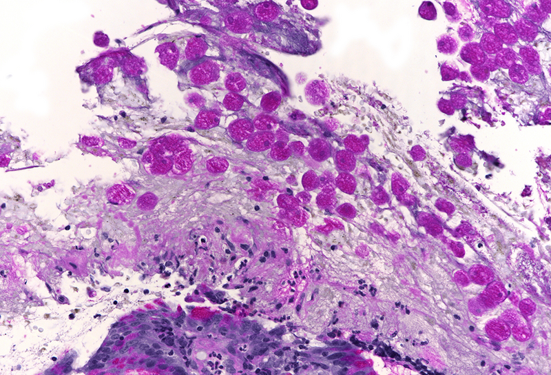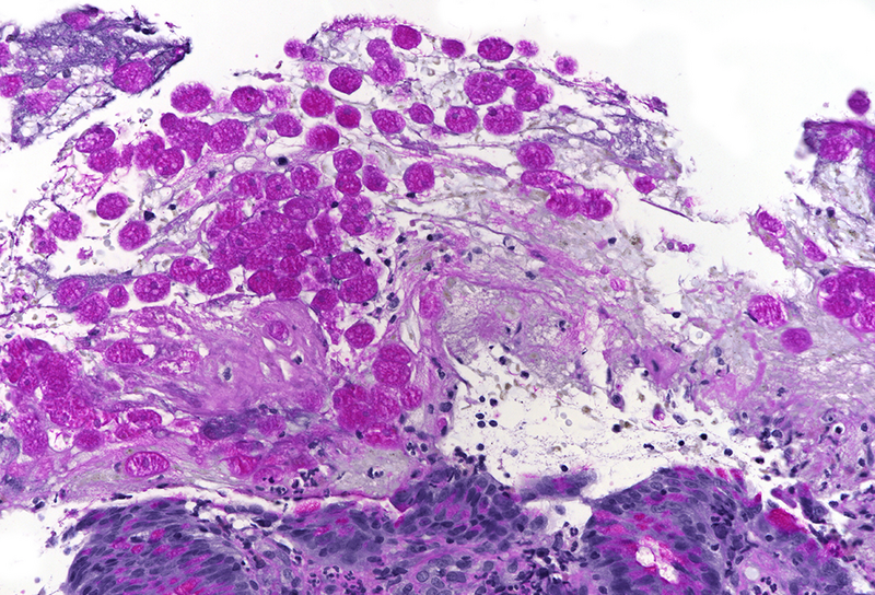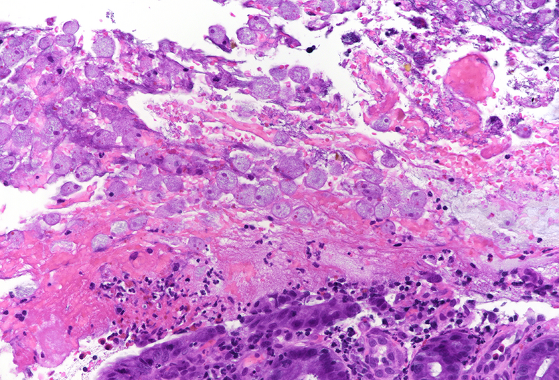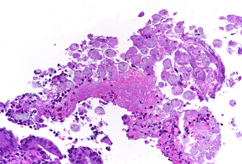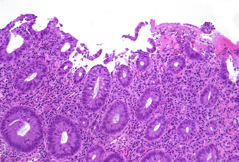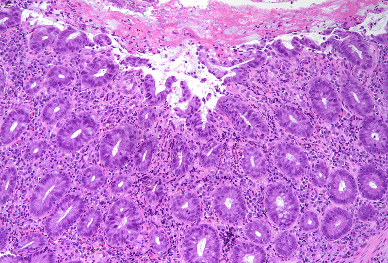 A 62-year-old male patient attends his physician for unspecific abdominal pain for two months. The symptoms had started with sudden-onset diarrhoea, successfully treated with antibiotics. No contact with animals or trips abroad were known/mentioned in the clinical record. Laboratory tests were unremarkable. No stool testing was performed. Colonoscopy showed erosions and ulcers with 2-4 cm of diameter covered with fibrin, in the cecum and transverse colon. Multiples biopsies were taken.
