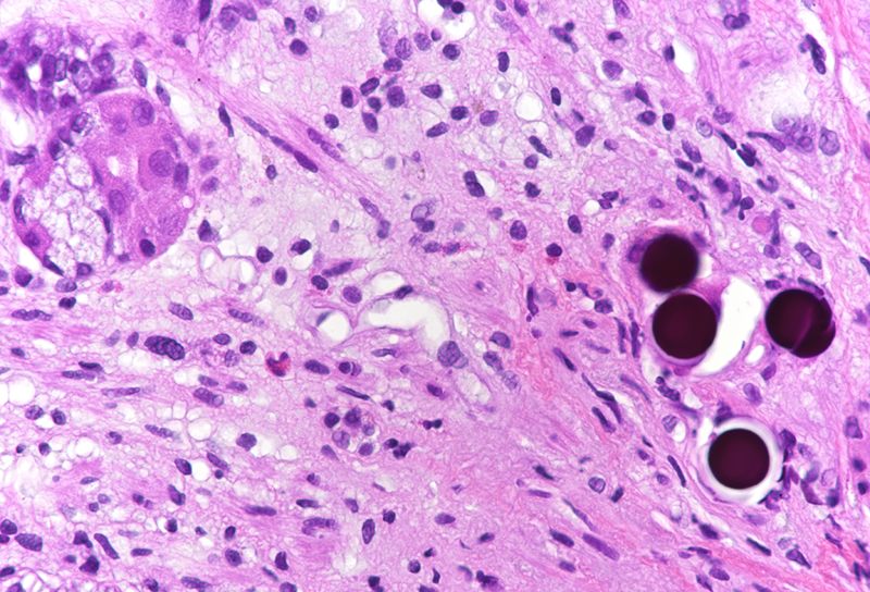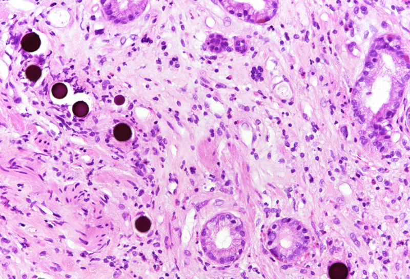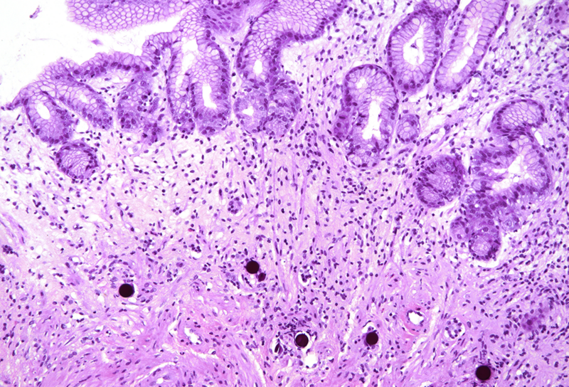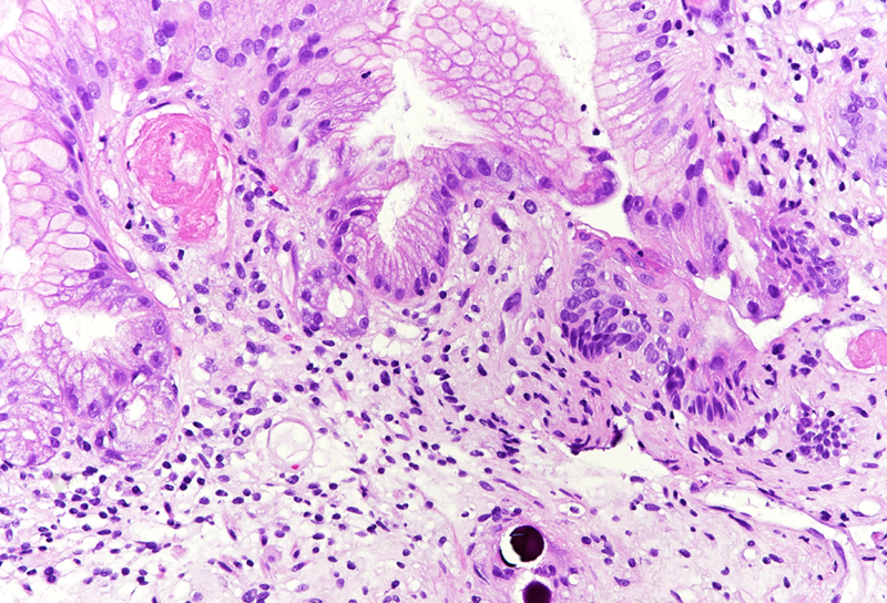A 55-year-old patient with established diagnosis of intrahepatic cholangiocarcinoma underwent multiple TACE and SIRT procedures as a palliative care treatment. During the period of receiving the treatments, he suffered from abdominal pain mainly located in the epigastric region and loss of appetite. Oesophagogastroduodenoscopy showed multiple ulcers in stomach and transpyloric region, Forest III, and bulbitis in the duodenum. Biopsies were taken according to the protocol.
