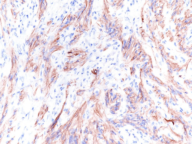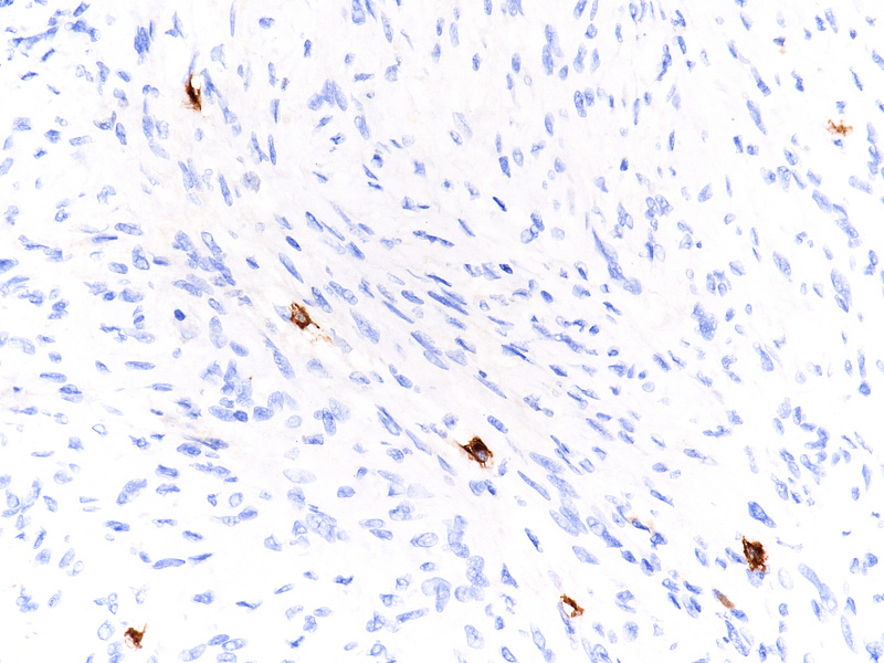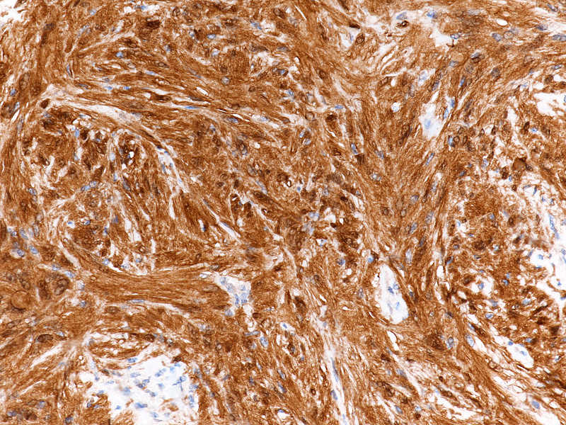 Confirmation by immunostaining is required given the mimicry of many mesenchymal tumours and the rarity of appendiceal schwannomas. A characteristic finding is the strong and diffuse positivity for S100 protein. Variable staining for GFAP and CD34 is present. Markers for GIST (CD117, DOG-1) are negative and positivity in Cajal cell hyperplasia or in scattered intralesional mastocytes is an important pitfall to consider. Also, muscle markers (desmin, smooth muscle actin) must be negative.