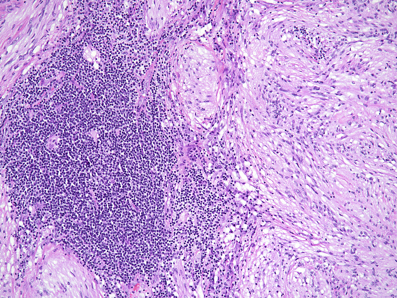 The characteristic morphology directs to the correct diagnosis: a well-circumscribed lesion, with a marbled appearance due to densely cellular areas alternating with densely cellular areas; and neoplastic spindled cells, sometimes with focal, degenerative atypia. Lymphoid cuffs, usually present in soft tissue schwannomas, have an unclear aetiology; in the appendix, its presence probably is due to remnants of local MALT-tissue. Long fascicular pattern, an epithelioid appearance, tumoral necrosis and increased mitotic activity must raise concern for malignant transformation to MPNST.