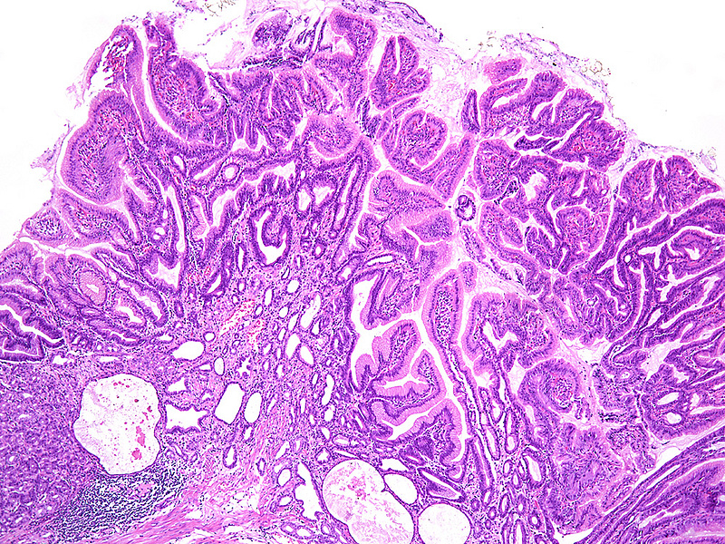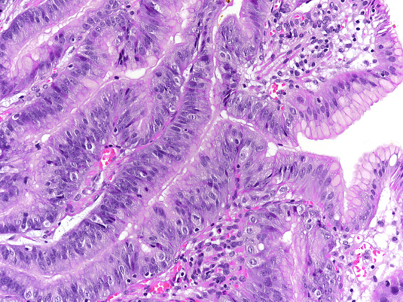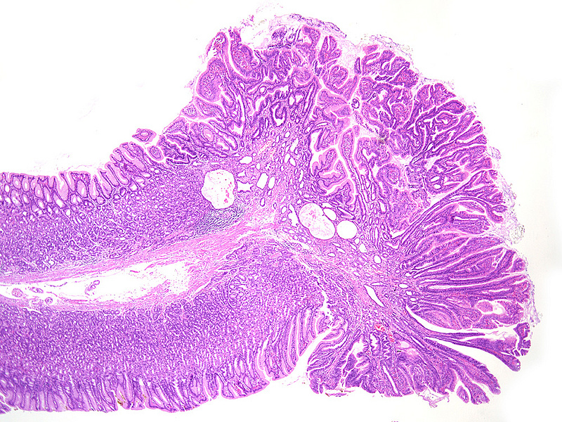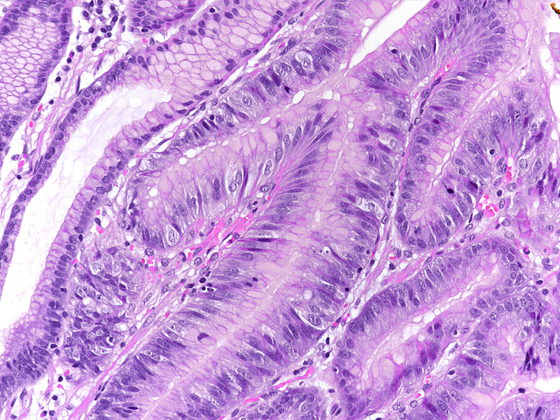Immunohistochemistry is not necessary for diagnosis. According to the publication, the neoplastic cells show strong and diffuse expression of MUC5AC, while they are negative or show only very low expression of MUC6, in particular at the basal portion of the neoplastic glands. Immunostaining for MUC2 and CD10 renders a negative result, thus exhibiting a pure gastric mucin phenotype (foveolar-cell differentiation). More studies are necessary, including molecular pathology, to elucidate the genetic profile of this peculiar new variant of foveolar-type adenoma, including potential differences between it and the traditional foveolar-type adenoma.