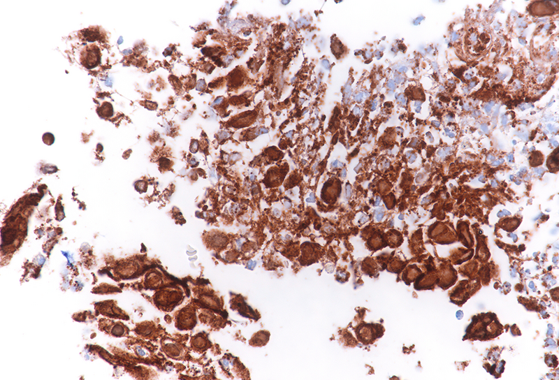 Cytology disclosed groups of squamous cells with enlarged ground-glass nuclei with homogenous chromatin pattern and multinucleation (Panels C-D). Upon histology, we observed multiple fragments of squamous epithelium with degenerating features admixed with inflammatory detritus. The nuclei of the squamous cells displayed ground-glass morphology as documented in the cytological material (Panels E-F). Immunostaining for Herpes simplex virus (HSV) I and II was positive (Panels G-H).