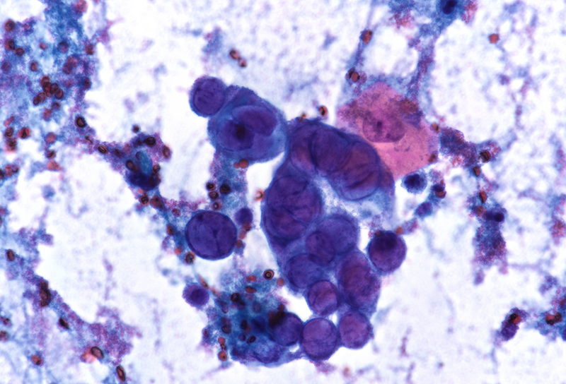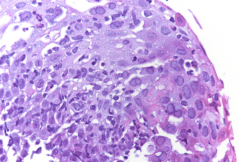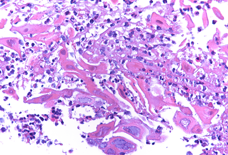 Histologically, the virus infects oesophageal squamous epithelium, typically at the superficial lateral margin of ulcers and erosions. The morphological diagnostic criteria include: (i) dense intranuclear eosinophilic to amphophilic round inclusion bodies with a clear halo separated from the nuclear membrane (Cowdry A inclusions), (ii) ground-glass nuclei with homogenous chromatin pattern, (iii) nuclear molding, (iv) multinucleated syncytia giant cells and (v) detached ballooning degeneration of infected cells. Immunohistochemistry studies is helpful in equivocal cases.
