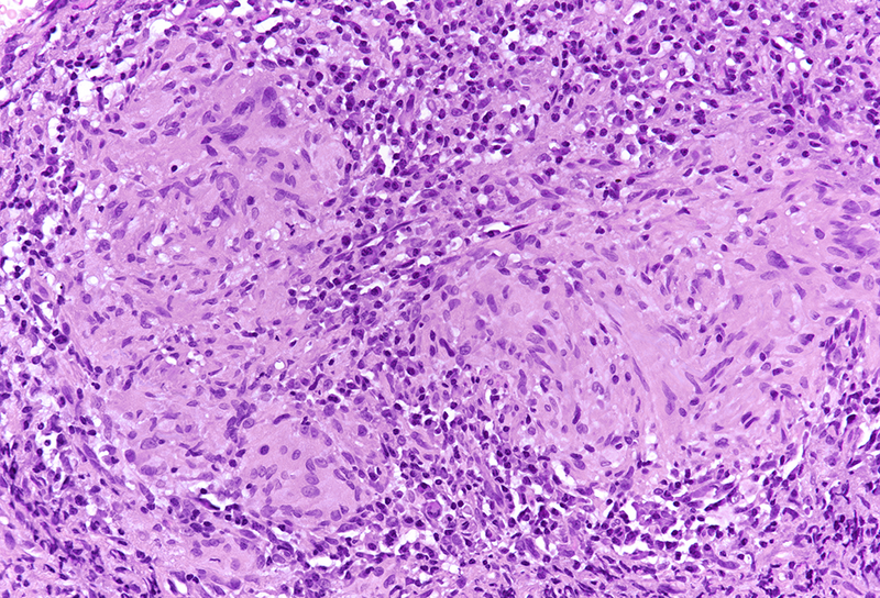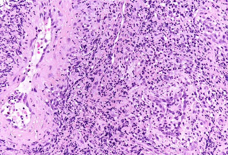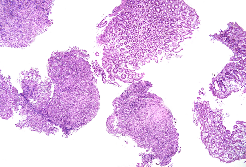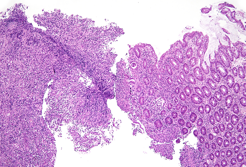 Intestinal vasculitis with granulomatosis is a rare finding in intestinal biopsies and differential diagnosis includes granulomatosis with polyangiitis (formerly known as Wegener’s granulomatosis), Behcet’s disease and Crohn’s disease. Intestinal involvement by microscopic polyangiitis with granulomatosis is reported in up to 11% of cases and any part of the small and large intestine can be affected. Intestinal involvement in Behcet’s disease is seen in up to 60% of cases and the ileocecal valve is the most involved site. In rare cases of microscopic polyangiitis with granulomatosis and Behcet’s disease, gastrointestinal manifestation is the first and leading sign of disease. Symptoms resemble those of chronic or acute bowel ischemia and in severe cases, bowel wall necrosis and perforation can occur. Histopathological examination can be essential in making the diagnosis but is not always contributary since inflamed blood vessels and granulomas might not be represented in superficial biopsies. The overlying mucosa often shows nonspecific inflammation, ulceration and ischemic changes. Since a considerable histomorphological overlap between gastrointestinal involvement by vasculitis and Crohn’s disease exists, correlation of the histopathological changes with the patient’s history, clinical (extraintestinal) findings and laboratory test results is needed.