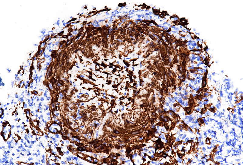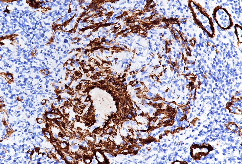 Microscopical examination showed unremarkable mucosa from the terminal ileum and most of the colonic biopsies. In biopsies from the transverse and sigmoid colon, fragments of only slightly altered colon mucosa were admixed with heavily inflamed and deeply ulcerated tissue, some biopsies consisted mainly of granulation tissue (Panel A). The preserved fragments of colon mucosa showed foci of acute inflammation with aphthous erosions, fissuring ulceration and occasional crypt abscesses. Crypt withering bordered mucosal defects (Panel B). Reactive and regenerative epithelial changes were noted in some of the biopsies, and small areas showed irregular crypts and pseudo-villous change, but no true architectural distortion or metaplastic change were observed. In the submucosa, small to medium-sized venous and arterial vessels showed marked infiltration of lymphocytes and neutrophilic granulocytes accompanied by wall thickening, focal fibrin deposition within the vascular wall and reactive endothelial cell changes, consistent with vasculitis (Panel C). Non-necrotic epithelioid cell granulomas were seen in association with the inflamed blood vessels (Panel D). Immunostaining for CD 31 (Panels E-F) and for smooth muscle actin (Panel G) highlighted the inflamed and partly obliterated vessels. No giant cells and no foreign material were detected. Few eosinophilic granulocytes were present within the surrounding inflammatory infiltrate.