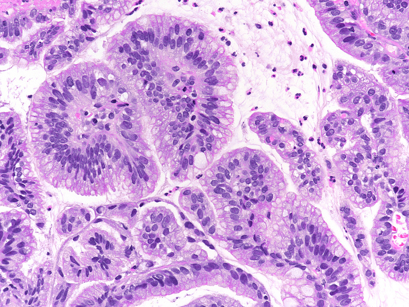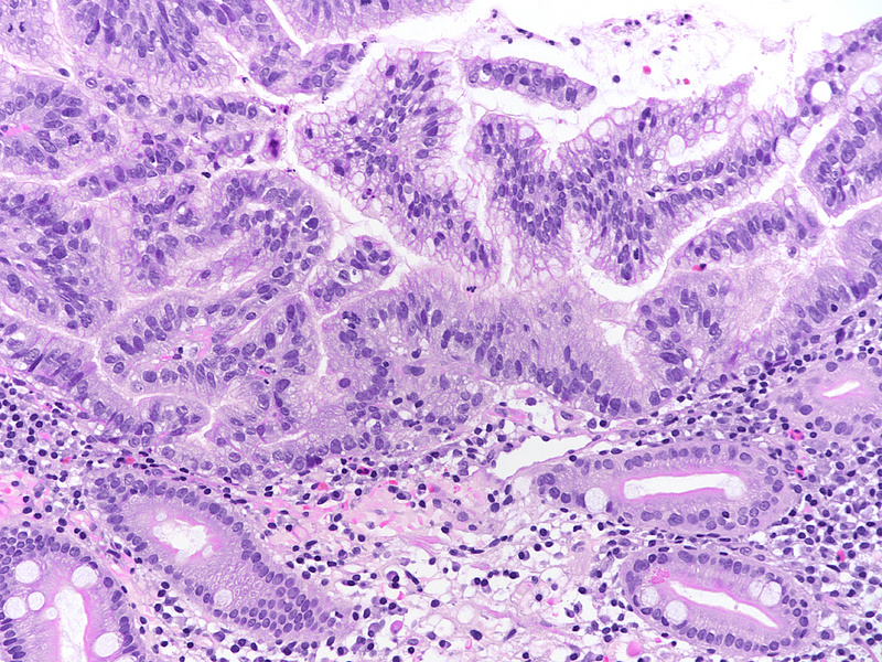 In recent years, several types of non-intestinal, that is, non-adenomatous dysplasia have been recognized. Of these, gastric foveolar dysplasia, as illustrated in our case, is the most frequent. It may be encountered within the stomach and at the gastro-esophageal junction, that is, in Barrett’s oesophagus. Gastric foveolar dysplasia is characterized by low columnar cells with clear / light eosinophilic cytoplasm (due to apical neutral mucin) and oval to round, often only slightly irregular nuclei.