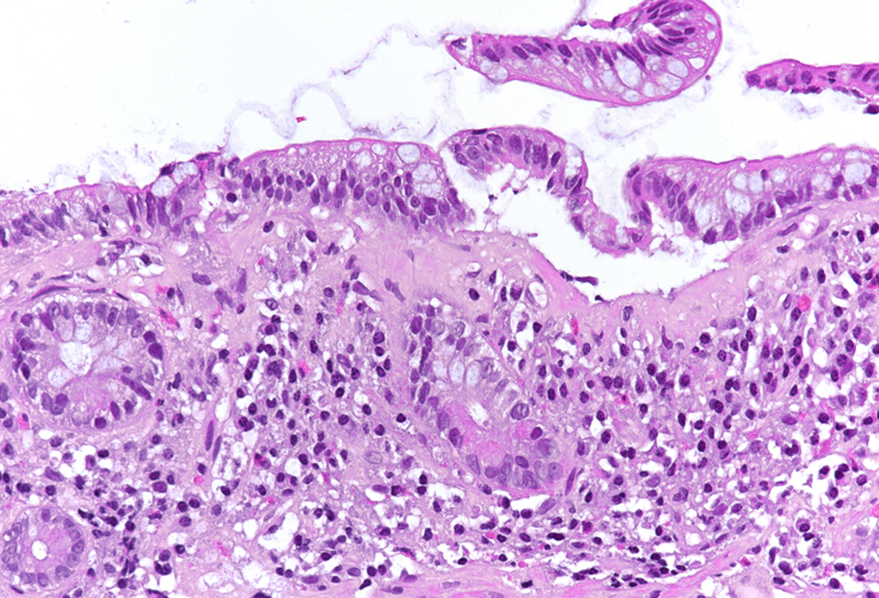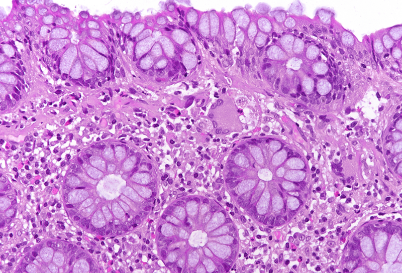A 66-year-old male patient presented with chronic watery diarrhoea and faecal incontinence. Colonoscopy showed nearly normal colon mucosa lacking obvious pathological changes; step biopsies were taken.