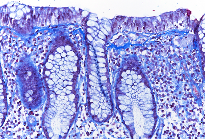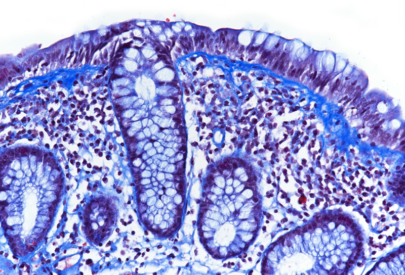 Collagenous colitis is a histological subtype of microscopic colitis, an inflammatory condition of the colon that causes chronic or recurrent watery, non-bloody diarrhoea. Microscopic colitis usually shows no or minimal mucosal changes on endoscopy but demonstrates typical histological changes. Collagenous colitis is characterized by thickening of the subepithelial collagen band (> 10 µm). The key feature of other histological subtype, lymphocytic colitis, is an increased number of surface intraepithelial lymphocytes (> 20 per 100 epithelial cells).