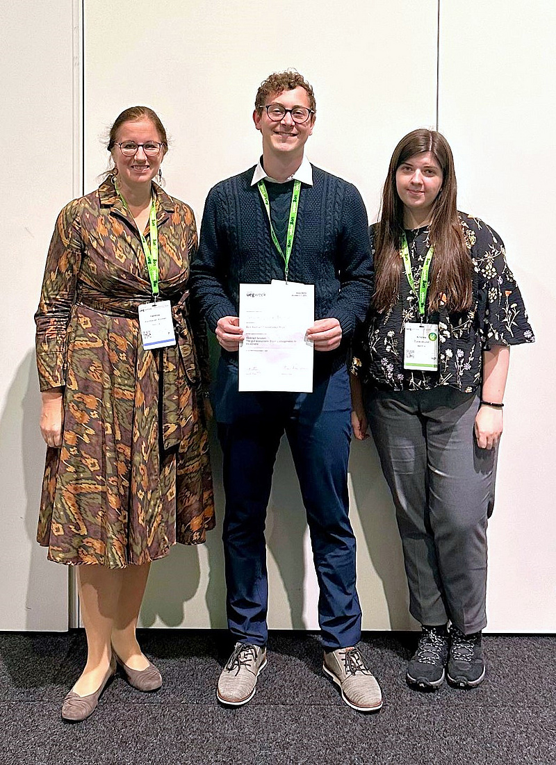 Christian Pacher-Deutsch, PhD-Student an der Klinischen Abteilung für Gastroenterologie und Hepatologie der Med Uni Graz, erhielt bei der UEG (United European Gastroenterology) Week den „Best Presentation Award“ für seine Präsentation zum Thema „Microplastic-induced alterations in gut microbiome and metabolism: insights from an ex vivo bioreactor model“. Die Studie untersucht, wie verschiedene Mikroplastikpartikel (MPs) das menschliche Darmmikrobiom beeinflussen. Sie ist Teil des MIcroONE-Projekts, das von CDmed geleitet wird und in dem die Med Uni Graz unter Projektleitung von Vanessa Stadlbauer-Köllner die Auswirkungen von Mikroplastik auf das Darmmikrobiom erforscht. Zudem erhielten Christian Pacher-Deutsch und Kristina Zukauskaite, ebenfalls von der Klinischen Abteilung für Gastroenterologie und Hepatologie, einen Travel Grant.