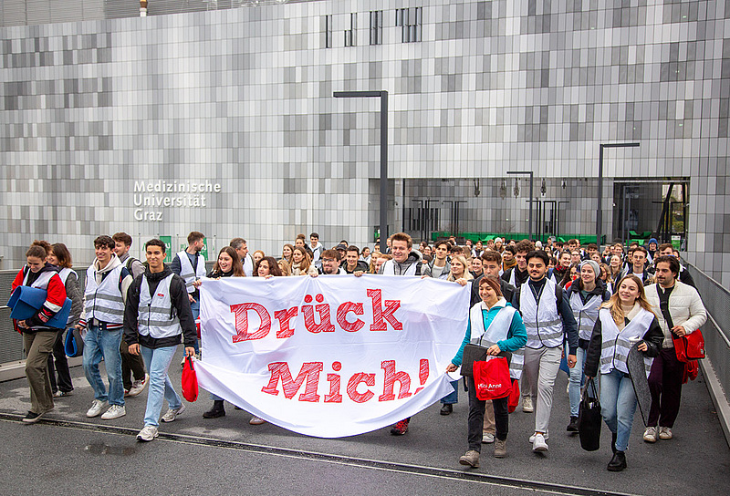 Jede zehnte Person in Österreich erleidet im Laufe ihres Lebens einen plötzlichen Herzstillstand – jederzeit und unabhängig vom Alter. Derzeit überleben nur etwa zehn Prozent ein solches Ereignis. Mit der Initiative „Drück Mich!“ setzt sich die Arbeitsgemeinschaft für Notfallmedizin dafür ein, dass möglichst viele Menschen die Wiederbelebung beherrschen. Würden mehr Ersthelfer*innen aktiv, könnten jährlich rund 1.000 zusätzliche Leben gerettet werden. Die Med Uni Graz und ihre Studierenden leisten mit ihrem Engagement einen entscheidenden Beitrag, um dieses Ziel zu erreichen – und um Graz an diesem Tag in eine Stadt voller potenzieller Lebensretter*innen zu verwandeln.
